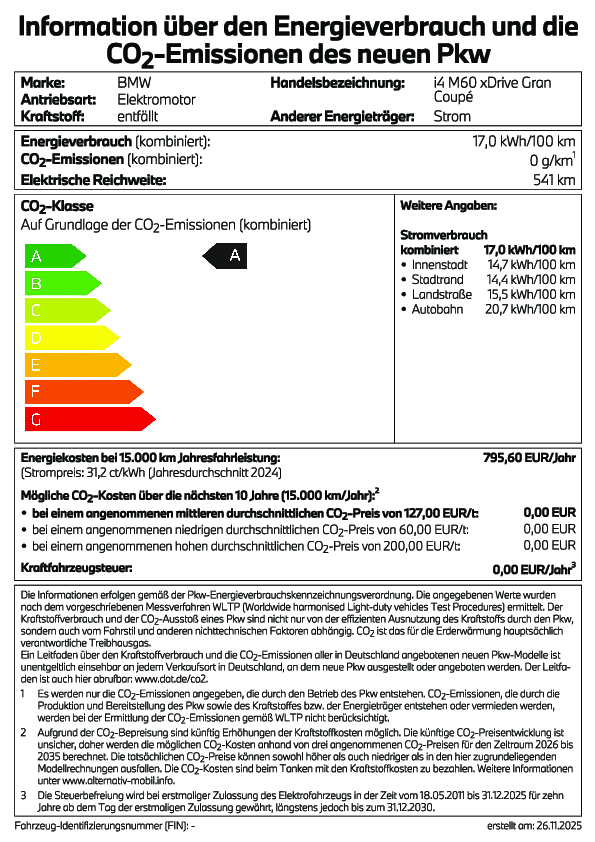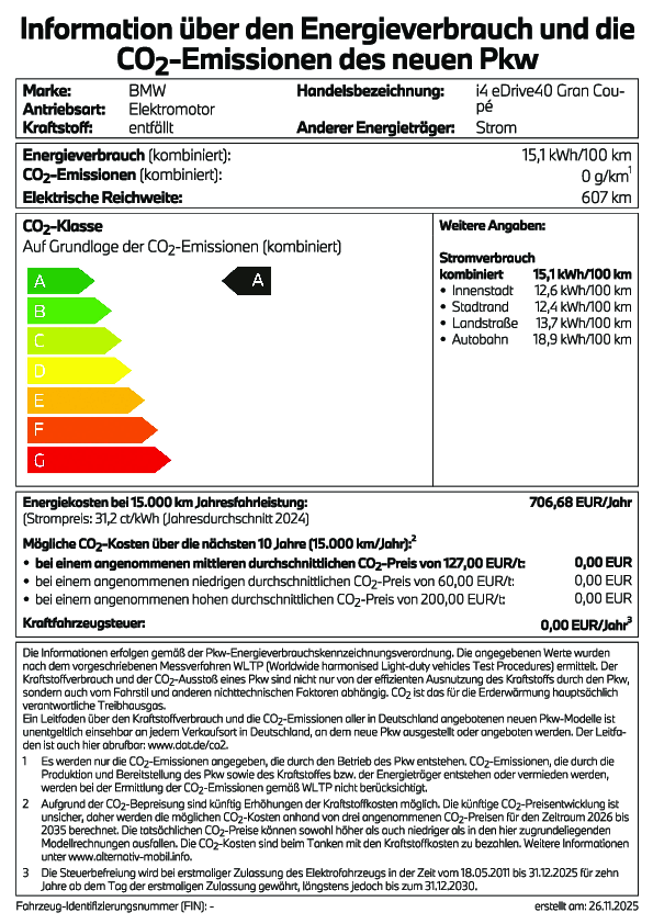 BMW i4 eDrive40 Gran Coupe: Vollelektrisch; Leistung 340 PS (250 kW); Energieverbrauch kombiniert in kWh/100 km: 15,1; CO2-Emission kombiniert in g/km: 0; CO2-Klasse: A.