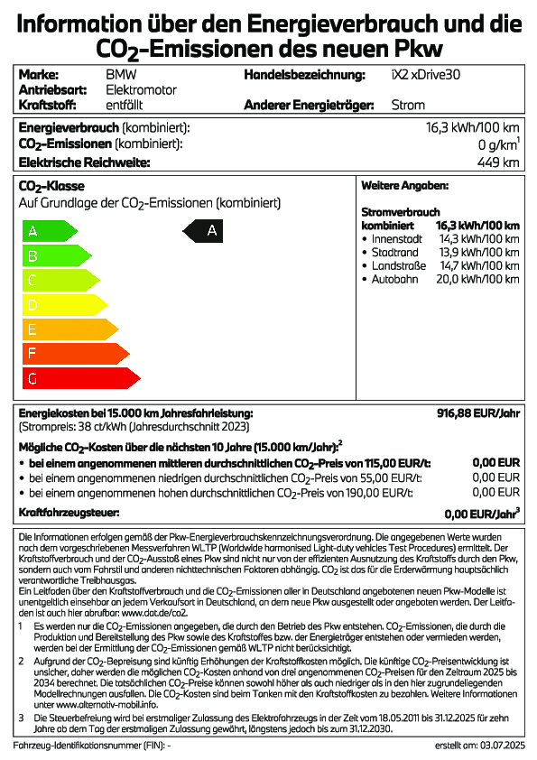 BMW iX2 xDrive30: Elektro; Elektrische Reichweite: 449 km,Energieverbrauch kombiniert in l/100 km: 16,03; CO2-Emission kombiniert in g/km: 0; CO2-Klasse: A.