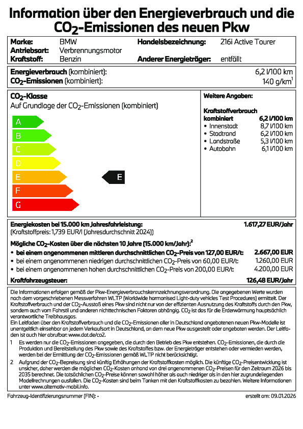 BMW 223i Active Tourer: Benziner, Leistung: 160 kW (218 PS), Energieverbrauch kombiniert in l/100 km: 6,6-6,0; CO2-Emission kombiniert in g/km: 149-137; CO2-Klasse: E.